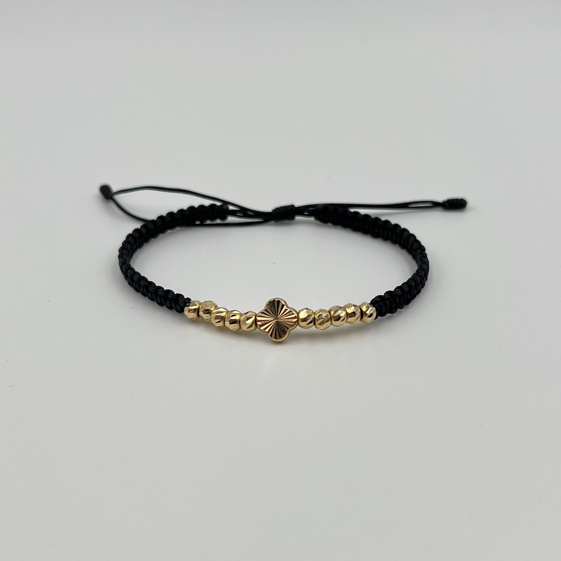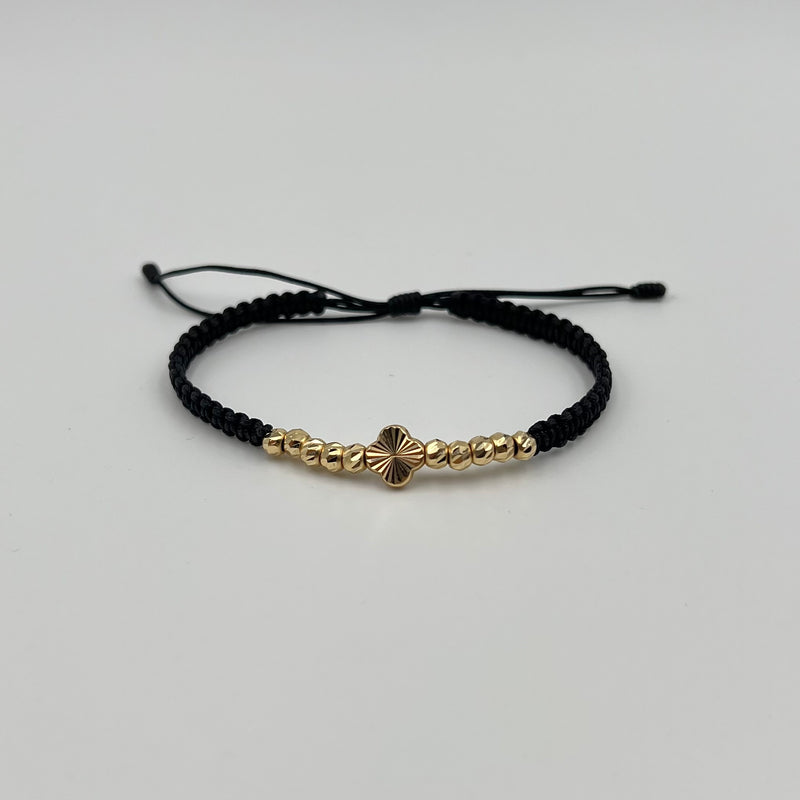PULSERA TEJIDA NEGRA / HERRAJE TREBOL DIAM / BOLA DIAMANTADA 4MM