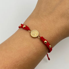 PULSERA TEJIDA ROJA / HERRAJE LETRA A / BOLA LISA 4MM